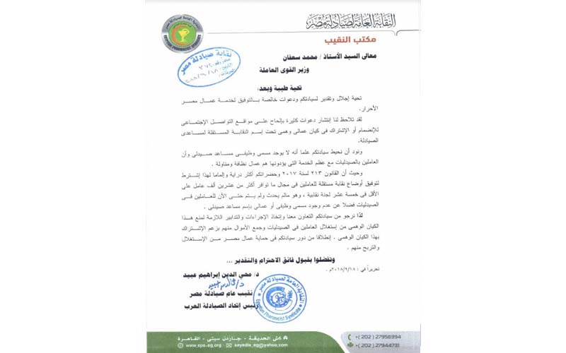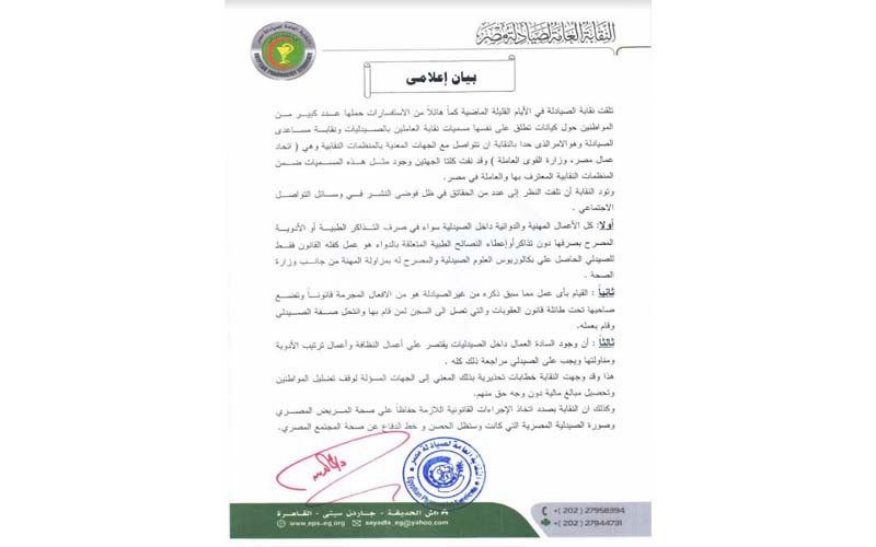 وكذلك أن النقابة بصدد اتخاذ الإجراءات القانونية اللازمة، حفاظًا على صحة المريض المصري، وصورة الصيدلية المصرية، التي كانت وستظل الحصن وخط الدفاع عن صحة المجتمع المصري.