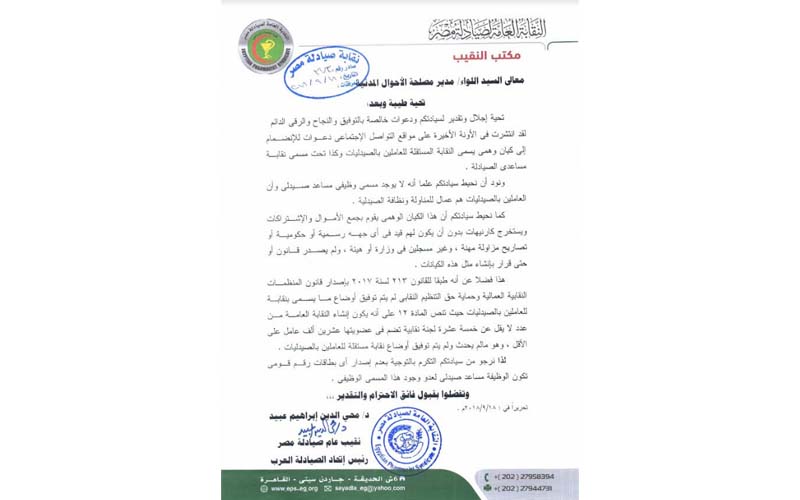 قالت نقابة الصيادلة على لسان متحدثها الإعلامي الدكتور أحمد أبودومة، إنها تلقت في الأيام القليلة الماضية كمًا هائلًا من الاستفسارات حملها عدد كبير من المواطنين حول كيانات تطلق على نفسها مسميات نقابة العاملين بالصيدليات ونقابة مساعدي الصيادلة، وهو الأمر الذي حدا بالنقابة أن تتواصل مع الجهات المعنية بالمنظمات النقابية وهي (اتحاد عمال مصر، وزارة القوى العاملة) وقد نفت كلتا الجهتين وجود مثل هذه المسميات ضمن المنظمات النقابية المعترف بها والعاملة في مصر.