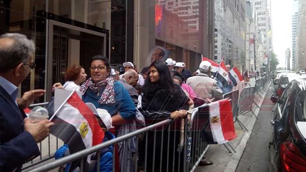 احتشد المصريون من مختلف ولايات أمريكا، الآن، أمام مقر إقامة الرئيس عبدالفتاح السيسي للاحتفاء به، رافعين الأعلام المصرية، هاتفين "تحيا مصر" و"بنحبك يا سيسي".