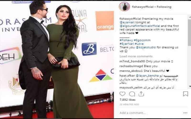 وعقب إثارة الجدل التي تسبب فيها الفيشاوي الصغير، قام بنشر صورة له برفقة زوجته "ندى"، على السجادة الحمراء على موقع الصور "إنستجرام"، معلقًا عليها: "أثناء عرض فيلمي (عيار ناري) في مهرجان الجونة، وأول ظهور مع زوجتي الجميلة ندى على السجادة الحمراء".