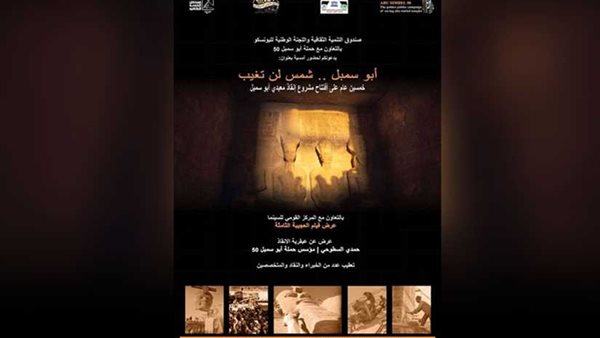 ينظم قطاع صندوق التنمية الثقافية بالتعاون مع اللجنة الوطنية لليونسكو وحملة أبو سمبل 50 في السابعة مساء الأحد 30 سبتمبر بقاعة "سينما الهناجر" - بساحة الأوبرا المصرية، أمسية بعنوان " أبو سمبل.. شمس لن تغيب". يديرها المعماري "حمدي السطوحي" مؤسس حملة أبو سمبل 50.