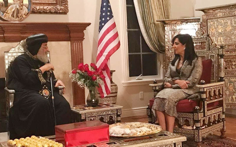 استقبل قداسة البابا تواضروس الثاني أمس بالمقر البابوي بسان فرنسيسكو السفيرة لمياء مخيمر قنصل مصر بلوس أنچلوس.