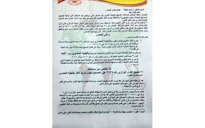 وقال الدكتور خليفة: بإنه تم عرض الموقف على رئيس الوزراء، وتم التوجيه لوزير البترول ورئيس الشركة القابضة للغازات الي بحضور النائب د.محمد خليفة لعمل اللازم لحل المشكلة وبحث الأزمة بما يحقق مصلحة أصحاب مصانع النسيج في القلعة الصناعية.