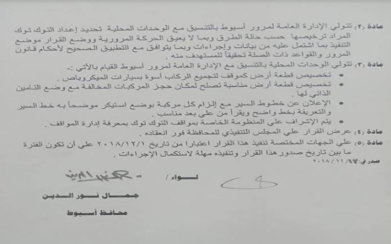 وأضاف المحافظ ان القرار نص في مادته الثانية على أن تتولى إدارة مرور أسيوط بالتنسيق مع الوحدات المحلية تحديد أعداد التوك توك المراد ترخيصها حسب حالة الطرق وبما لا يعوق الحركة المرورية ووضع القرار موضع التنفيذ بما اشتمل عليه من بيانات وإجراءات وبما يتوافق مع التطبيق الصحيح لأحكام قانون المرور والقواعد ذات الصلة تحقيقا للمستهدف منه، كما نص القرار في مادته الثالثة أن تتولى الوحدات المحلية بالتنسيق مع الإدارة العامة للمرور تخصيص قطعة ارض كموقف لتجميع الركاب أسوة بسيارات الميكروباص وتخصيص قطعة ارض مناسبة تصلح لمكان حجز المركبات المخالفة مع وضع التأمين الذاتي لها والإعلان عن خطوط السير مع الزام كل مركبة بوضع استيكر موضح به خط السير والتعريفة بخط واضح يقرأ من على بعد مناسب، على أن يتم الإشراف على المنظومة الخاصة بمواقف التوك توك بمعرفة إدارة المواقف.