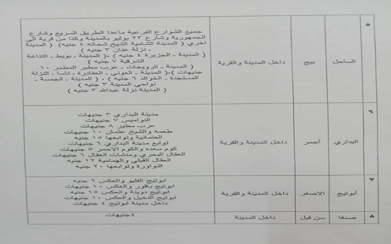وأضاف المحافظ أن القرار تضمن في مادته الأولى تخصيص اللون البني لمركز ديروط وخط سيره داخل المدينة والقرى بتعريفة قدرها 5 جنيهات وتخصيص اللون الأبيض لمركز القوصية وخط سيره مير- بني قرة– فزارة– المنشأة الكبرى بتعريفة 5 جنيهات، واللون البرتقالي لمركز منفلوط وخط سيره داخل مدينة منفلوط ماعدا شارع جمال عبد الناصر– شارع جناين ايوب– شارع أحمد ماهر– شارع العشرين بتعريفة 5 جنيهات بالنسبة للمراكز البحرية، أما المراكز القبلية فتم تخصيص اللون الأزرق لمركز أسيوط وخط سيره داخل القرى فقط بتعريفة قدرها 4 جنيهات واللون الأخضر لمركز الفتح بخط سير قرية بني زيد/ قرية بني مر/ قرية الفيما/ عرب مطير بتعريفة قدرها 3 جنيهات واللون البني لمركز أبنوب وخط سيره داخل المدينة والقرى بتعريفة قدرها 2 جنيه للفرد واللون الرمادي لمركزي الغنايم وخط سيره داخل القرى بتعريفة قدرها 5 جنيهات داخل المدينة ومن المدينة للقرية 10 جنيهات وكذا من قرية لأخرى، واللون البيج لمركز ساحل سليم وخط سيره داخل المدينة والقرى بتعريفة قدرها 4 جنيهات من المدينة إلى الشامية أو الشيخ شحاتة في جميع الشوارع الفرعية ماعدا الطريق السريع وشارع الجمهورية وشارع 23 يوليو بالمدينة و3 جنيهات من المدينة إلى نزلة عنان ومن المدينة إلى الجزيرة 4 جنيهات ومن المدينة إلى بويط أو التناغة الشرقية 7 جنيهات ومن المدينة إلى الرويجات أو عرب مطير المطمر 10 جنيهات ومن المدينة إلى العونة أو العفادرة أو تاسا أو النزلة المستجدة أو الخوالد 6 جنيهات ومن المدينة إلى الجمسة أو نواحي المدينة 3 جنيهات ومن المدينة إلى نزلة عبد الله 3 جنيهات.
