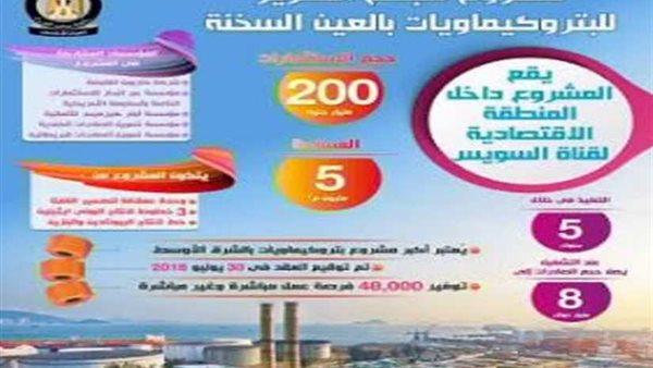 الإنفوجراف يوضح أن المشروع يقع بالمنطقة الاقتصادية لقناة السويس، بحجم استثمارات 200 مليار جنيه .