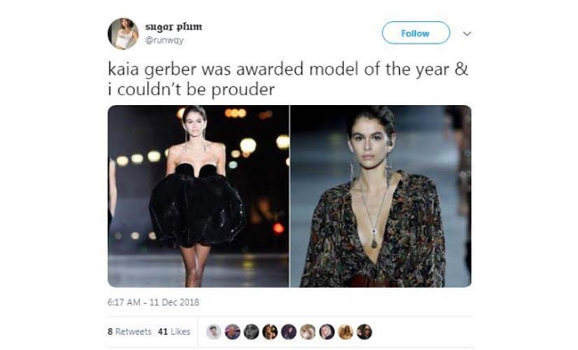 منح مجلس الأزياء البريطاني "The British Fashion Council"، لقب "موديل العام" لكايا جربر، ابنة عارضة الأزياء الأمريكية، سيندي كروفورد.