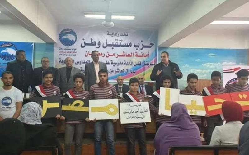 أقام حزب مستقبل وطن، برئاسة المهندس أشرف رشاد، بمحافظة الشرقية، مسابقة لاختيار أفضل مجموعة طلاب يقدمون الإذاعة المدرسية عن مدارس الثانوي على مستوى إدارة العاشر من رمضان التعليمية، بحضور "فاتن فتحي" مديرة الإدارة بالعاشر، والمهندس أحمد الخطيب، عضو هيئة مكتب الحزب بالمحافظة، وقداسة الأب "إبرام" راعي كنيسة ماري جرجس بالعاشر، والدكتور "أيمن تعيلب"، عميد كلية الآداب بجامعة قناة السويس، والدكتور "أحمد الجمل"، وجميع أمناء الأمانات الفرعية ومساعديهم بهيئة مكتب مستقبل وطن بالعاشر.