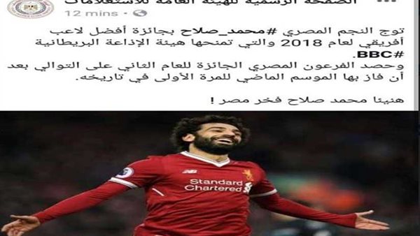هنأت الهيئة العامة للإستعلامات، الدولي المصري محمد صلاح نجم فريق ليفربول الإنجليزي، على تتويجه بجائزة أفضل لاعب في إفريقيا المقدمة من هيئة الإذاعة البريطانية BBC وذلك للعام الثاني على التوالي.