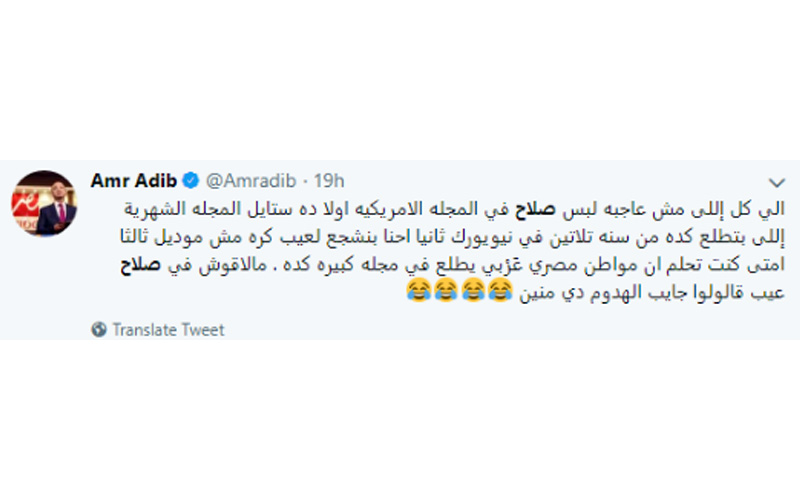 وكعادته لم يستطع الإعلامي عمرو أديب الوقوف صامتا أمام الهجوم على صلاح، فغرد عبر تويتر، قائلا: "إلي كل اللى مش عاجبه لبس صلاح في المجلة الأمريكية، أولا ده ستايل المجلة الشهرية اللي بتطلع كده من سنة تلاتين في نيويورك، ثانيا إحنا بنشجع لعيب كرة مش موديل، ثالثا أمتى كنت تحلم أن مواطن مصري عَرْبي يطلع في مجلة كبيرة كده. مالاقوش في صلاح عيب قالولوا جايب الهدوم دي منين".