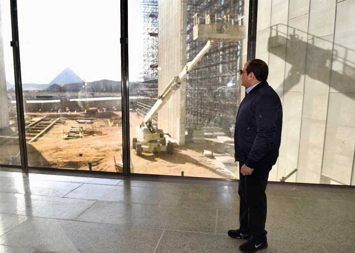 وأضاف بسام راضي أن الرئيس السيسي تفقد كذلك مشروع المتحف المصري الكبير، والذي يبلغ معدل العمالة اليومية به حوالي 8 آلاف فرد يوميًا، وقد وصل إلى مراحل متقدمة من التنفيذ، تشمل إنشاء أكبر متحف في تاريخ الحضارة الإنسانية، وضمان إدارته وتشغيله طبقًا للمعايير العالمية، وتطوير المنطقة المحيطة به لتصبح مقصدًا سياحيًا وثقافيًا وتعليميًا وترفيهيًا متكاملًا، حيث تبلغ إجمالي مساحة أرض المتحف حوالي 500 ألف متر مربع، منها ما يقرب من 168 ألف متر مربع مناطق عرض متحفي لـ100 ألف قطعة أثرية، فضلًا عن احتواء المتحف على العديد من المتاحف الفرعية والمكتبات وفصول الحرف والفنون وقاعات المحاكاة وصالة العرض المؤقت للتبادل الثقافي مع مختلف الحضارات ومركز متكامل للمؤتمرات والساحات الخارجية المتضمنة الحدائق والمناطق الخدمية وموقف السيارات.