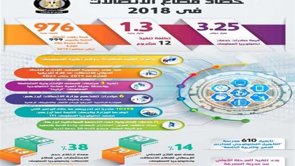 انطلاقًا من حرص المركز الإعلامي لمجلس الوزراء، على تسليط الضوء على الجهود المبذولة من قبل الدولة في تنفيذ العديد من المشروعات بقطاع الاتصالات وتكنولوجيا المعلومات خلال عام 2018، فقد أعلن المركز الإعلامي عن تأسيس 999 شركة جديدة برؤوس أموال بلغت 976 مليون جنيه خلال الفترة من يناير حتى سبتمبر 2018، بجانب تنفيذ 12 مشروعا بقيمة 1.3 مليار جنيه، مضيفًا وصول قيمة صادرات خدمات تكنولوجيا المعلومات إلى أكثر من 3.25 مليار دولار.