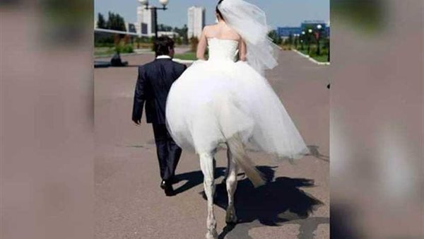 غير أن المصور تواجد في المكان المناسب لتظهر الصورة وكأن أطراف الفرس الخلفية مكملة لجسم العروس على ظهره.