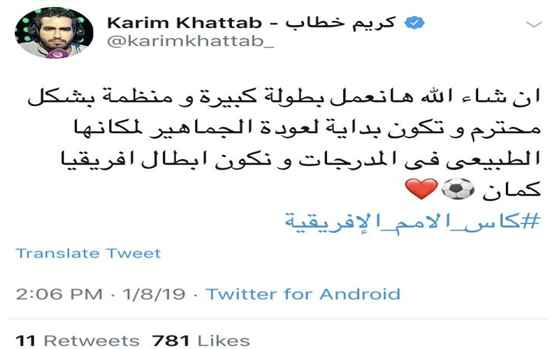 كما غرد الإعلامي كريم خطاب: "إن شاء الله هنعمل بطولة كبيرة ومنظمة بشكل محترم، وتكون بداية لعودة الجماهير لمكانها الطبيعي في المدرجات، ونكون أبطال إفريقيا كمان".