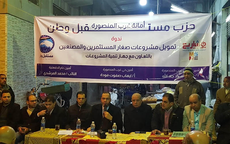 نظم حزب مستقبل وطن، بمحافظة الدقهلية، ندوة لتوعية وتشجيع الشباب على إنشاء المشروعات المتوسطة والصغيرة، تحت عنوان "تمويل مشروعات صغار المستثمرين المصنعين"، وذلك بمنطقة السلخانة بحي غرب بالتعاون مع جهاز تنمية المشروعات المتوسطة والصغيرة والمتناهية الصغر.