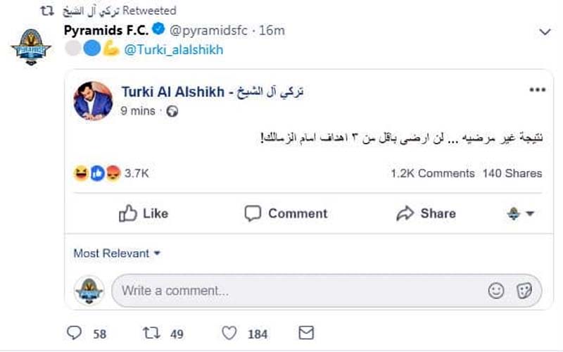 وكان تركي آل الشيخ أكد انه لن يرضى بأقل من 3 أهداف بمرمى الزمالك بالمباراة التي ستجمع الفريقين يوم الخميس المقبل عقب تعادل بيراميدز مع فريق الإنتاج الحربي الأسبوع الماضي.