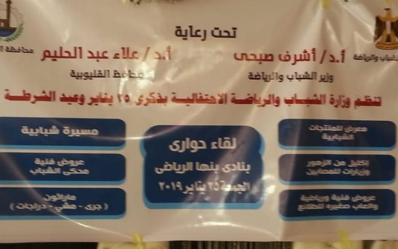 تنفذ إدارة البرلمان والتعليم المدنى بمديرية الشباب والرياضة بالقليوبية، بمشاركة جميع أندية التطوع وأندية المرأة ، لقاء حوارى تحت عنوان "مواجهة الإرهاب " بنادى بنها الرياضى، وذلك عقب الإنتهاء من الفترة الصباحية للإحتفال بثورة 25 يناير وعيد الشرطة.