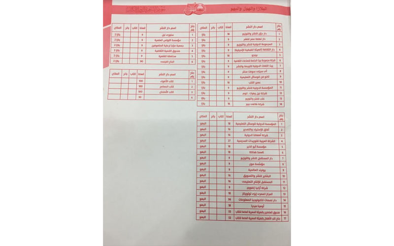 وتسهيلا على الزائرين تنشر "بوابة روزاليوسف" صور قوائم أرقام الأجنحة وأماكن دور النشر والهيئات والوزارات المشاركة في المعرض حتى يتمكن كل زائر من الوصول لدار النشر أو الجناح الذي يريده بسهولة، حيث تم تقسيم المعرض إلى 4 صالات عرض وبكل صالة تم تقسيم العارضين وإعطاؤهم رقما للجناح الخاص بهم فيمكنك بسهولة الوصول للصالة بعد مطالعة القائمة ومن خلال الترتيب الوصول لجناح دار النشر التي تريدها بسهولة.