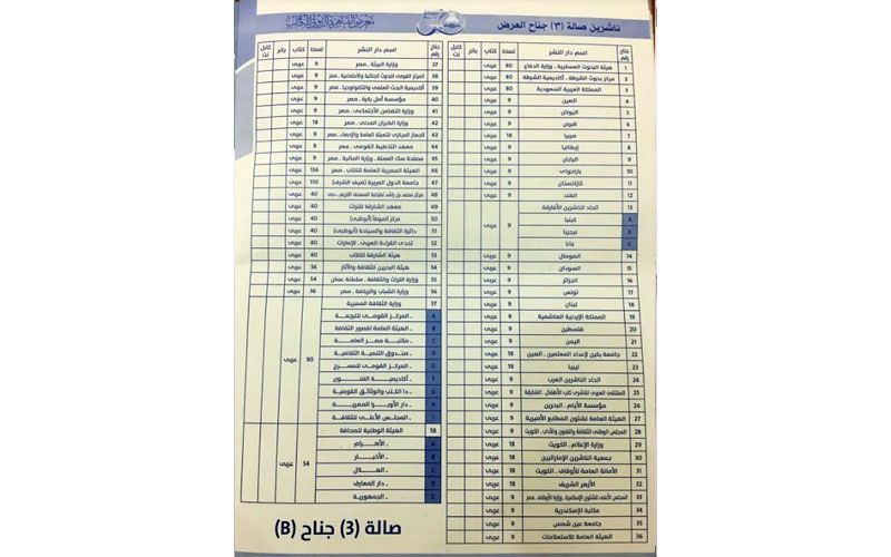 على سبيل المثال لو أردت أن تبحث عن جناح مؤسسة روزاليوسف الصحفية وهي موجودة بصالة رقم 3 جناح A ورقم مكان العرض الخاص بها هوA7 في حين انه مثلا لو اردت الوصول لدار اليازوري العلمية من الأردن ستجدها في نفس الجناح برقم B60 وهكذا حيث يمكنك بسهولة مشاهدة رقم كل جناح بسهولة والبحث عن رقم كل عارض ما يوفر عليك الوقت والجهد خاصة للباحثين.