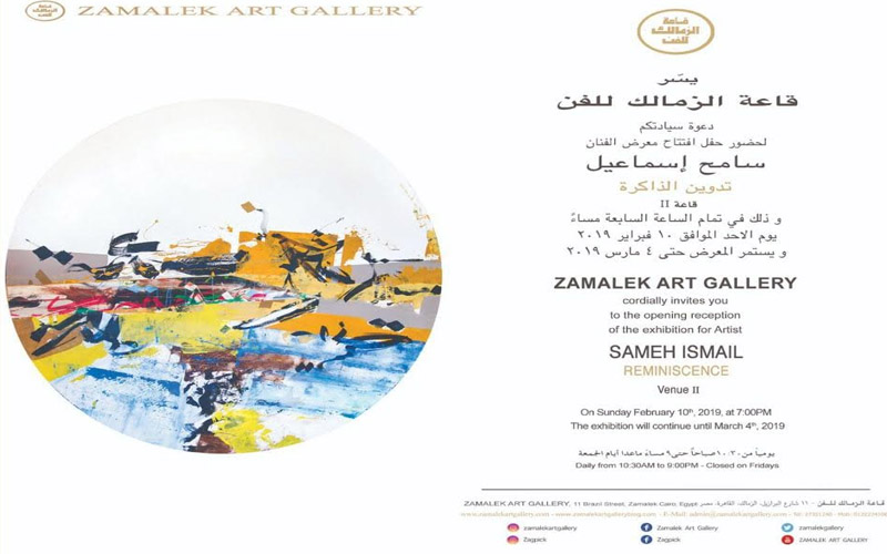 يفتتح اليوم الأحد 10 فبراير 2019 معرض الفنان سامح إسماعيل تحت عنوان "تدوين الذاكرة" المقام بقاعة الزمالك للفن، ويستمر المعرض إلى يوم 4 مارس يواصل الفنان رحلته في البحث في العلاقة بين الموسيقى والفن بالإضافة إلى استمرار محاولات التجريب في الخط العربي
