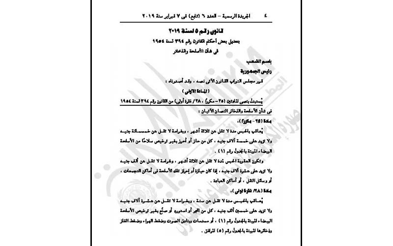 وقع الرئيس عبد الفتاح السيسي قانون رقم ٥ لسنة ٢٠١٩ بتعديل بعض أحكام القانون رقم ٣٩٤ لسنة ١٩٥٤ في شأن الأسلحة والذخائر.