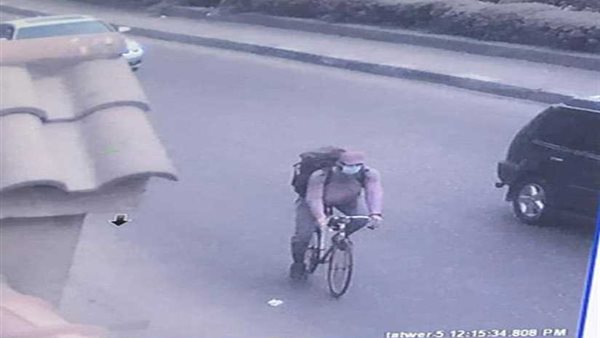 وظهر في البداية في شارع قريب من محيط جريمة الجمعة، رصدته كاميرات مراقبة يمر أمام مديرية أمن القاهرة، ثم ظهر في مقطع آخر وهو يعبر الطريق بمنطقة الحسين، حيث يوجد سور حديدي به فتحة مرور أفراد، قام بالمرور منها، حاملاً دراجته.