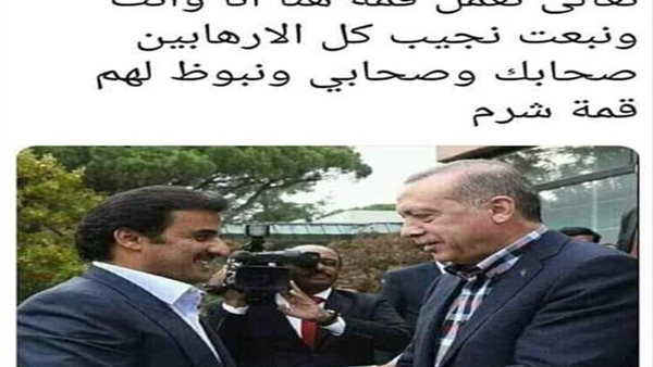 ونشر رواد "فيس بوك "صورة تجمع "أردوغان "و"تميم"، وكتبوا أعلاها ساخرين "تعال نعمل قمة هنا أنا وأنت ونبعت نجيب كل الإرهابيين صحابك وصحابي ونبوظ لهم قمة شرم".