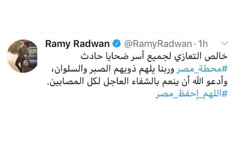 جاء ذلك على صفحاتهم الشخصية بموقع التواصل الاجتماعي "تويتر"، وقال الإعلامي رامي رضوان: "خالص التعازي لجميع أسر ضحايا حادث #محطة_مصر وربنا يلهم ذويهم الصبر والسلوان، وأدعو الله أن ينعم بالشفاء العاجل لكل المصابين.