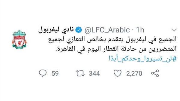 ونشر نادي ليفربول عبر حسابه بموقع تويتر: "الجميع في ليفربول يتقدم بخالص التعازي لجميع المتضررين من حادثة القطار اليوم في القاهرة.. لن تسيروا وحدكم أبدًا".