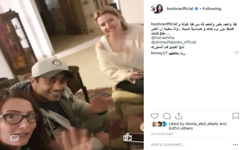 بشرى التي تواجدت في منزل فلوكس وشيحة، نشرت صورة تجمعها بالثنائي من هناك، عبر حسابها بموقع إنستجرام، وأرفقتها بتعليق: "هنا وأحمد بخير والحمد لله بس هنا عيانة وعندها دور برد جامد وحساسية شديدة.. وأنا سعيدة إن الخبر طلع فشنك".