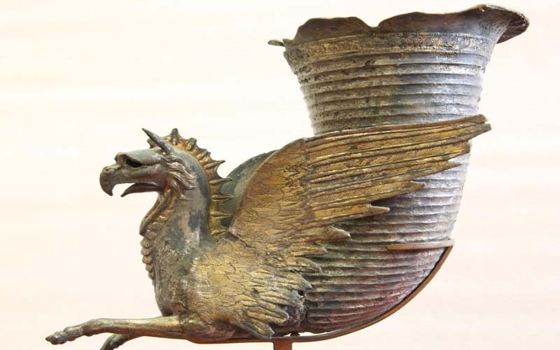 وعن إناء الشرب أوضحت عبد الرازق، أنه تم تصميمه على شكل حيوان خرافى مجنح وتم العثور عليه فى طوخ الكراموس بمحافظة الشرقية عام 1905م بداخل معبد طوخ الكراموس ؛ ويرجح أنه يرجع للعصر البطلمى، وتم العثور عليه مع عدد كبير من الأوانى والحلى المصنوعة من الفضة والذهب.