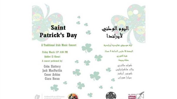 بمناسبة اليوم الوطني لأيرلندا، يقيم مركز إبداع قبة الغوري" بالغورية"، التابع لقطاع صندوق التنمية الثقافية، ليلة موسيقية لعزف الموسيقي الأيرلندية بالتعاون مع سفارة أيرلندا بالقاهرة، وذلك في الثامنة مساء الجمعة 15 مارس.