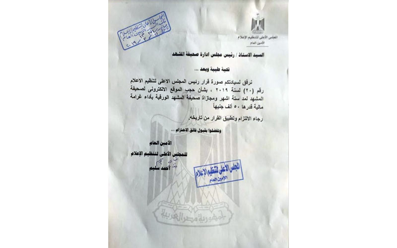 قرر المجلس الاعلى لتنظيم الاعلام حجب موقع جريدة المشهد لمدة ٦ شهور وتغريمه ٥٠ألف جنيه.