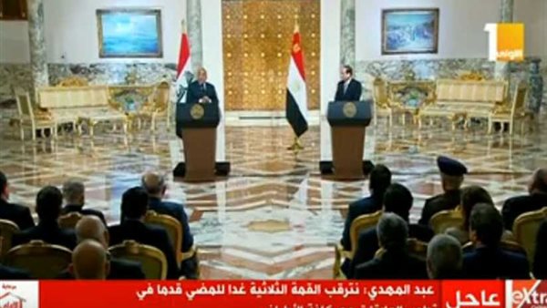 ينعقد الآن مؤتمر صحفي بين الرئيس عبد الفتاح السيسي، ورئيس وزراء العراق عادل عبد المهدي.