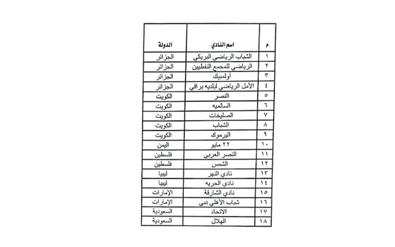 من جانبه أكد أحمد أبو عيشة، عضو مجلس إدارة الاتحاد، أن الأندية و الهيئات التى أكدت مشاركتها يصل عددها إلى 45 هيئة، مقسمة إلى 4 من الجزائر، و5 من الكويت، و1 من اليمن، و3 من فلسطين، و2 من ليبيا، بالإضافة على 2 من الإمارات، ومثلها من السعودية، بينما يشارك من مصر 37 ناديا وهيئة.
