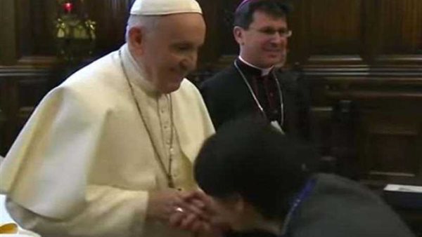 ويبدو الكثيرون في حيرة من تصرف البابا بسحب يده وعدم تقبيلها.