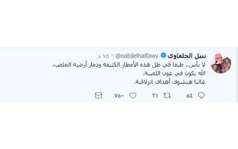 بينما قال نبيل الحلفاوي: "لا بأس.. طبعا في ظل هذه الأمطار الكثيفة ودمار أرضية الملعب. الله يكون في عون اللعيبة. غالبا هنشوف أهداف انزلاقية".