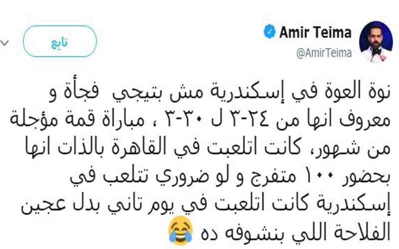 بينما كتب الملحن أمير طعيمة: "نوة العوة في الإسكندرية مش بتيجي فجأة ومعروف أنها من ٢٤-3 لـ٣٠-٣، مباراة قمة مؤجلة من شهور، كانت اتلعبت فى القاهرة بالذات أنها بحضور ١٠٠ متفرج ولو ضروري تتلعب في إسكندرية كانت اتلعبت في يوم تاني بدل عجين الفلاحة اللي بنشوفه ده".