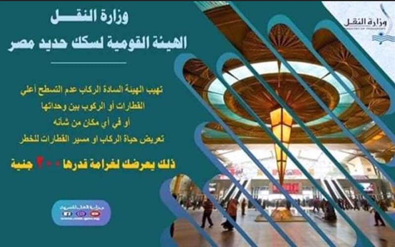 200 جنيه غرامة من يقوم بالتسطيح اعلى القطارات أو الركوب بين العربات أو في نهاية القطارات "السبنسة" ما يعرض حياته للخطر