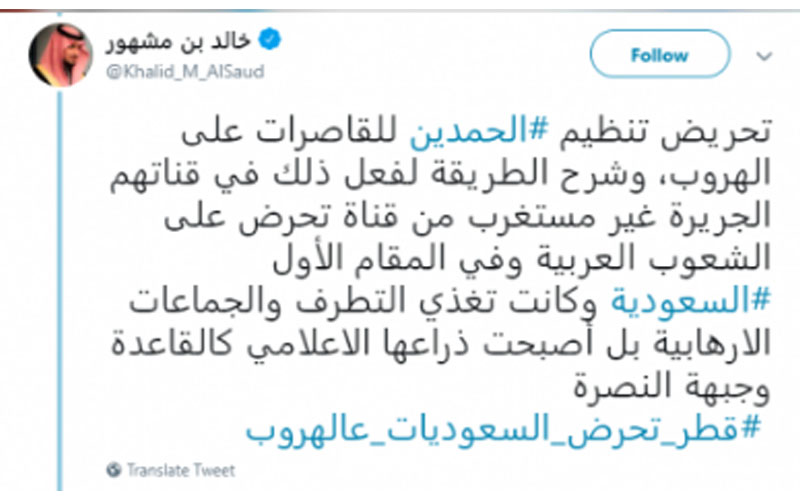 وذكر حساب خالد بن مشهور، ضمن تعليقه على فيديو الجزيرة المسيء أن حذف الفيديو هو جزء من دعاية مضادة تنتهجها القناة التابعة لتنظيم الحمدين الإرهابي. وأضاف: "أعتقد أن (حذف المقطع مقصود) وهو جزء من خطة الدعاية له وهي محاولة لنشره بشكل أوسع نظام الحمدين لا يحمل قيما ومبادئ وأخلاقا، لذلك لا يمكن أن يشعر بتأنيب الضمير فجأة ويحذف المقطع". وقال في تغريدة سابقة له: "تحريض تنظيم الحمدين للقاصرات على الهروب، وشرح الطريقة لفعل ذلك في قناتهم الجزيرة غير مستغرب من قناة تحرض على الشعوب العربية وفي المقام الأول السعودية، وكانت تغذي التطرف والجماعات الإرهابية بل أصبحت ذراعها الإعلامي كالقاعدة وجبهة النصرة".
