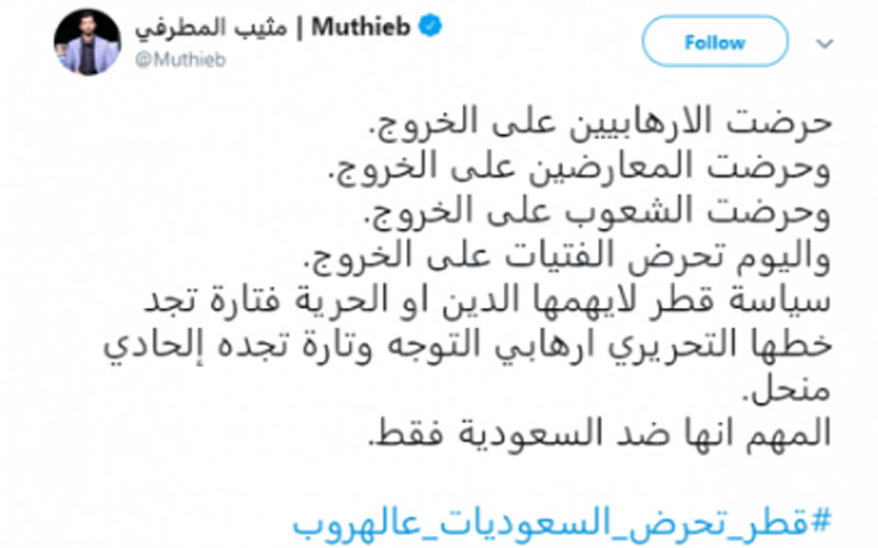 وذكر حساب الإعلامي مثيب المطرفي أن هذه هي عادة الجزيرة دوما فهي "حرضت الإرهابيين المعارضين للشعوب على الخروج، على أنظمة الحكم في دولهم وإثارة الفوضى واليوم تحرض الفتيات على الخروج".