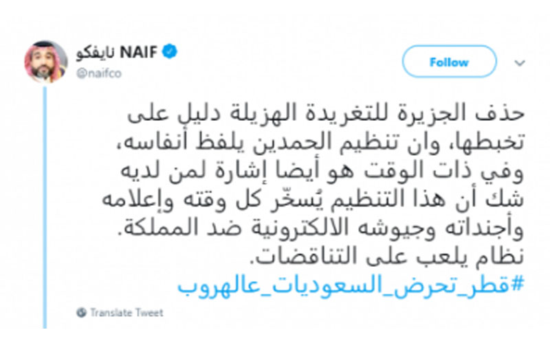 وغرد حساب الناشط السعودي "نايفكو" معلقاً على فيديو الجزيرة بقول: "حذف الجزيرة للتغريدة الهزيلة دليل على تخبطها، وأن تنظيم الحمدين يلفظ أنفاسه، وفي ذات الوقت هو أيضا إشارة لمن لديه شك أن هذا التنظيم يُسخّر كل وقته وإعلامه وأجنداته وجيوشه الإلكترونية ضد المملكة. نظام يلعب على التناقضات".