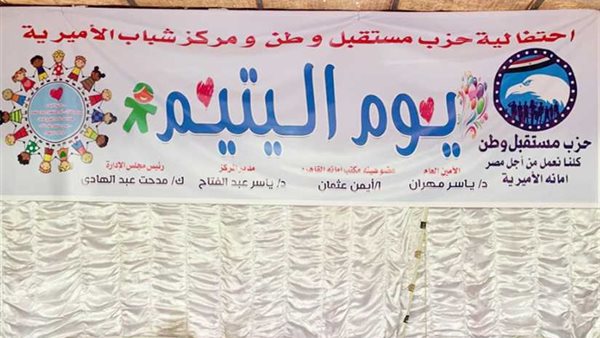 نظم حزب مستقبل وطن، برئاسة المهندس أشرف رشاد الشريف، في محافظة القاهرة، احتفالية كبرى بيوم اليتيم، في مركز شباب الأميرية، وذلك فى إطار رسم البسمة على وجوه الأطفال الأيتام.
