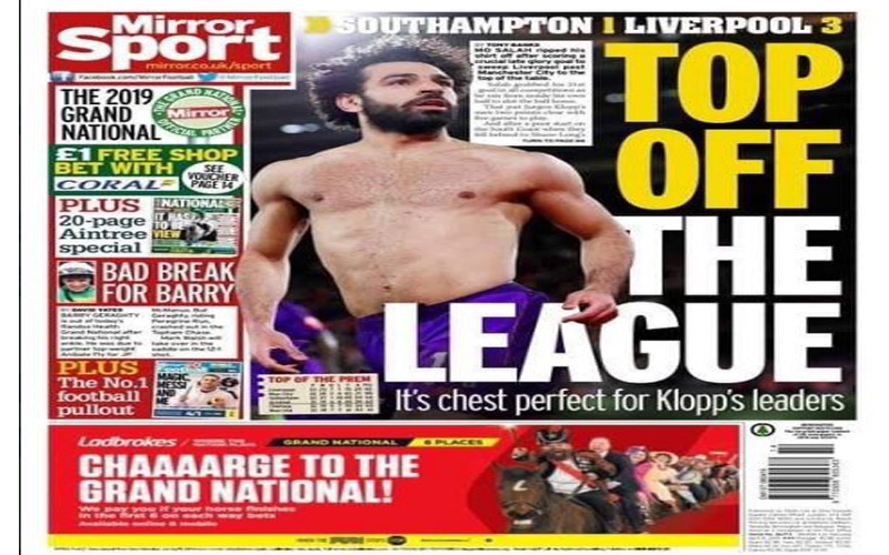 صحيفة "ميرور": "قمة الدوري"، ونشرت صورة احتفال محمد صلاح بعودته للتهديف بعد صيام دام 6 مباريات بمسابقة "البريميرليج".