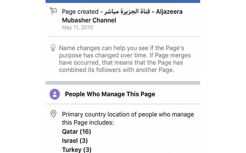 بتصفح بيانات الصفحة، الآن، يظهر أن من بين مديري الصفحة يوجد 16 من قطر و3 بإسرائيل و3 بتركيا.