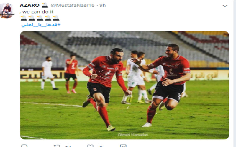 دشن الآلاف من مشجعي النادي الأهلي على موقع التواصل الاجتماعي "تويتر"، هاشتاج #قدها_يا_أهلي، دعمًا لفريق النادي الأهلي في مسابقة دوري أبطال إفريقيا"، وذلك قبل اللقاء المنتظر اليوم في الساعة السادسة مساءً، مع صن داونز.