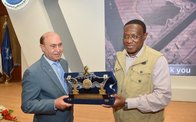 ثم أهدى الفريق مُهاب مميش درع قناة السويس الجديدة لكل من السفير ممادو لابرنج سفير دولة الكاميرون عميد السلك الإفريقي، والسفير ماهر العدوي نائب مساعد وزير الخارجية للشئون الإفريقية.