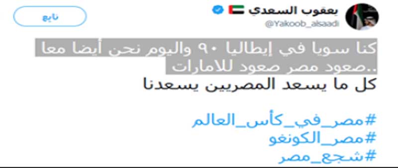 بوابة "روزاليوسف" قامت بعرض بعض من تغريدات السعدي, التي غرد فيها حبا في مصر وأبنائها: