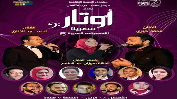 يقيم مركز طلعت حرب الثقافي بـ"السيدة نفيسة"، التابع لصندوق التنمية الثقافية، في السادسة مساء الخميس 18 إبريل، حفل لفرقة أوتار بقيادة الفنان محمد خيري، والفنان أحمد عبد الخالق، بمناسبة الاحتفال بأعياد الربيع.