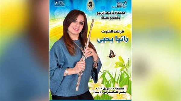 تقيم فراشة الفلوت الدكتورة رانيا يحيى تحتفل بأعياد الربيع وعيد تحرير سيناء بقصر المانسترلى التابع لصندوق التنمية الثقافية بوزارة الثقافة يوم الجمعة ١٩ ابريل الجارى في الثامنة مساء يشاركها فى الحفل فرقتها الموسيقية وأبنائها يحيى الهرميل وفريدة الهرميل.